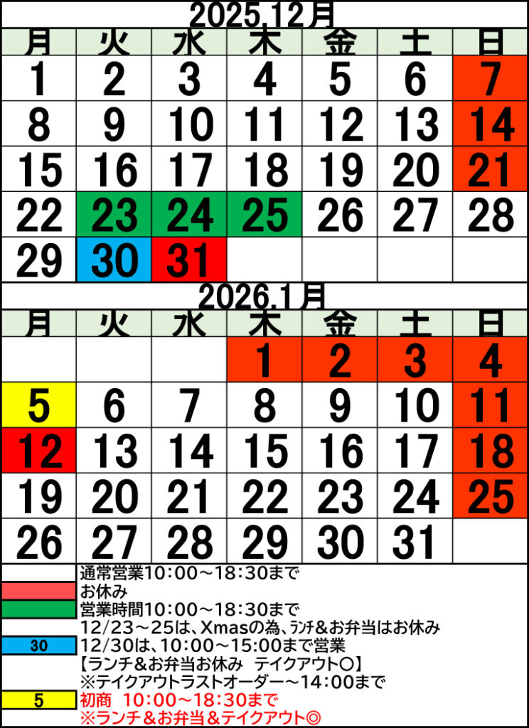 休業期間:2025年12月30日(火)15:00~2026年1月4日(日)